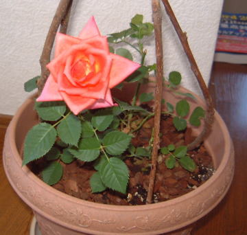 今日は苗の整理をしました。分解したハンギングからでた苗を手入れして庭に植えました。とてもかわいそうなことに、くたんくたんになっている苗ばっかり。元気のいい苗は鉢植えにしました。すこし元気がでてきたら、写真をアップしようと思います。この写真はミニバラ(室内)。オレンジだったのになんか色が変。